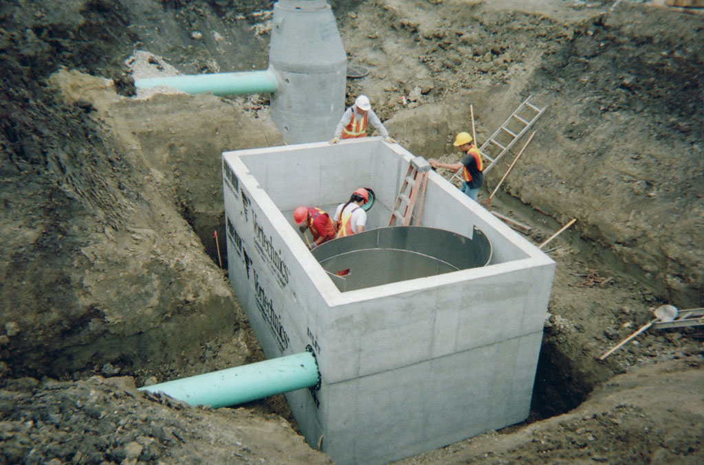 Water/Storm Water Separation System (It separates the oils that might be in the water so they don't do down into the existing steams). GS crews excavating to complete the Storm Water Management Facility of the subdivision. Excavating for the Storm Water Management Facility. Installation of the Vortechs Oil-Grit Separator.